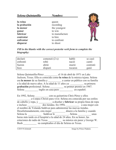 Selena Quintanilla Biography Worksheet For Reviewing Preterite Verbs Sub Plan Teaching Resources
